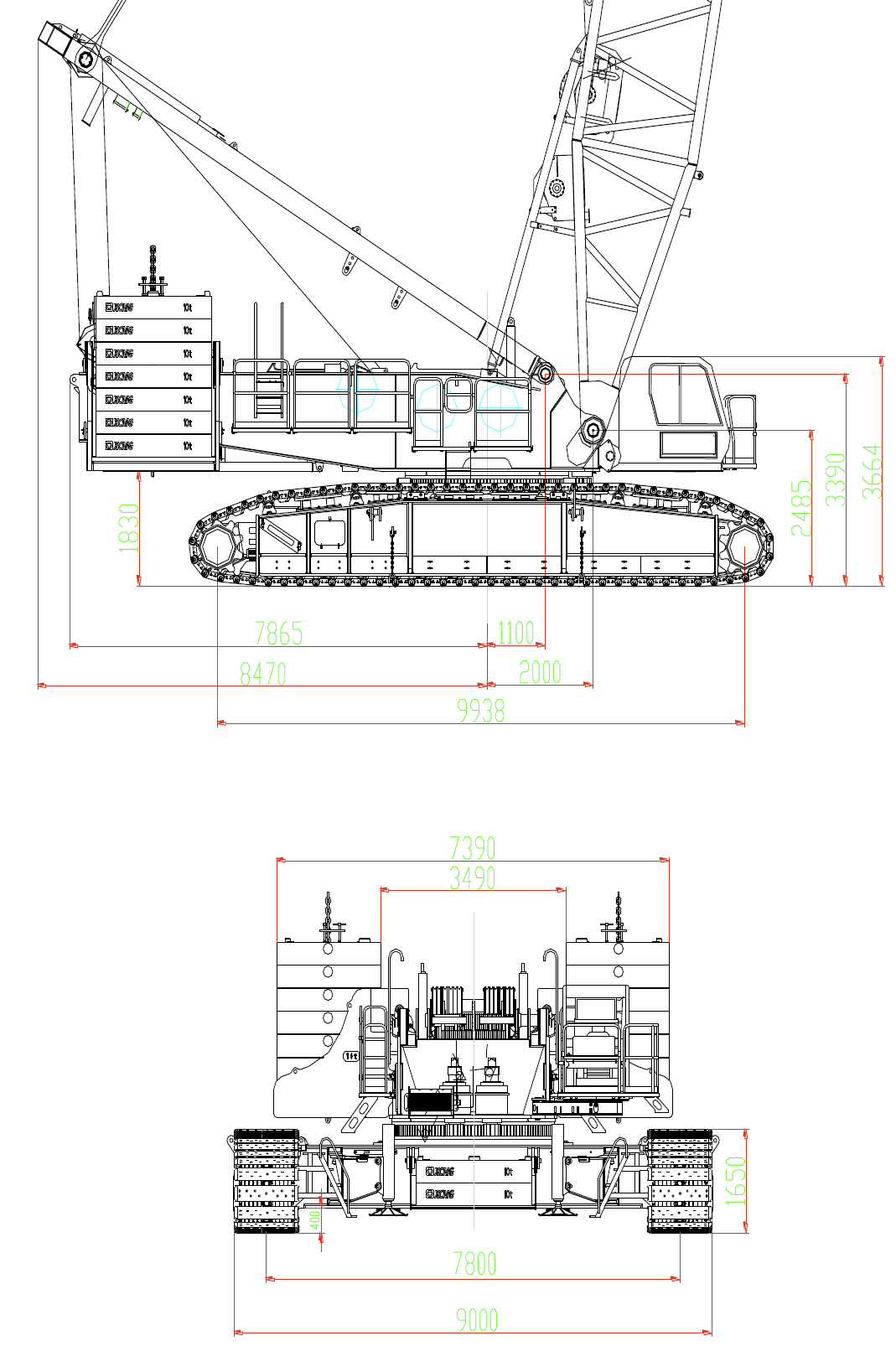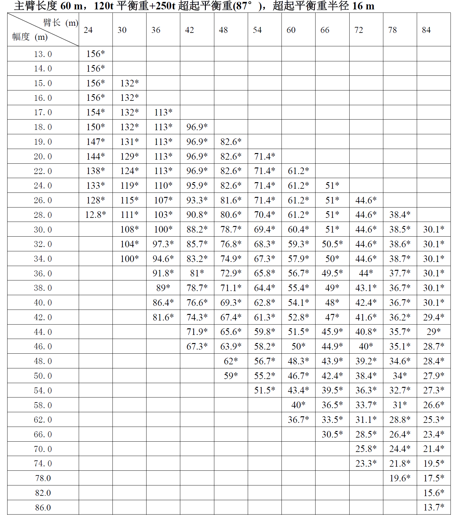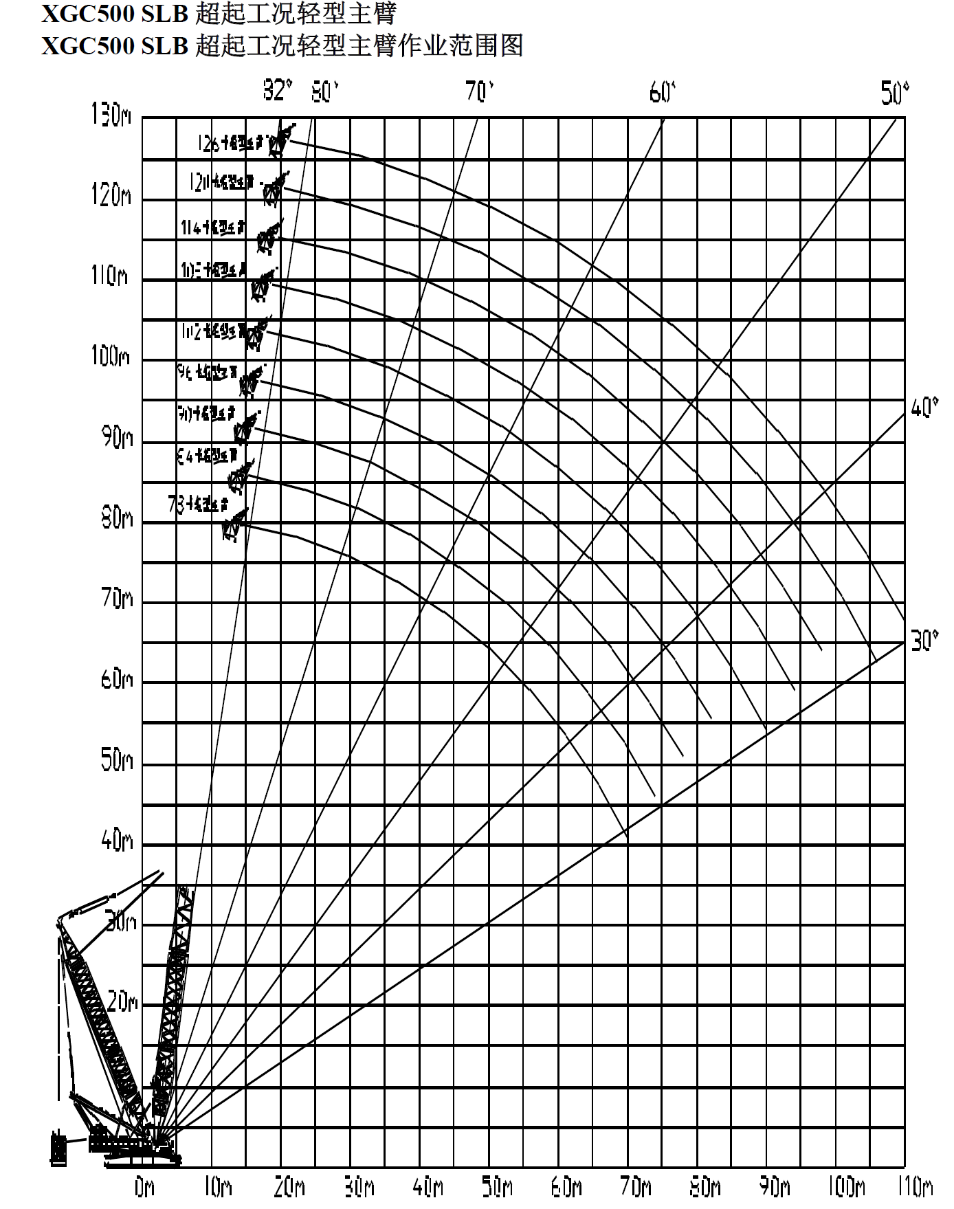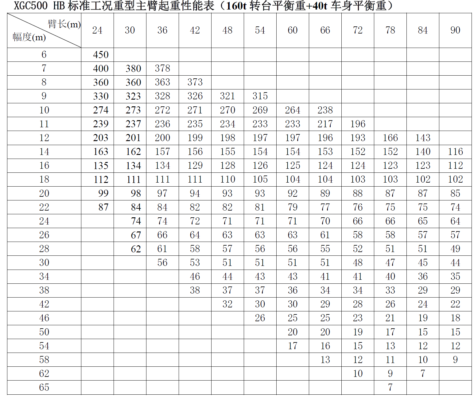 2)SLB:超起轻型主臂,1 个10.5 米重型底节,1 个6 米厚壁主臂中间节,2 个12 米厚壁主臂中间节,2 个12 米薄壁主臂中间节,1 个6 米过渡节,2 个6米塔式副臂厚壁中间节,1 个12 米塔式副臂厚壁中间节,2 个12 米塔式副臂薄壁中间节,1 个7.5 米塔式副臂顶节。