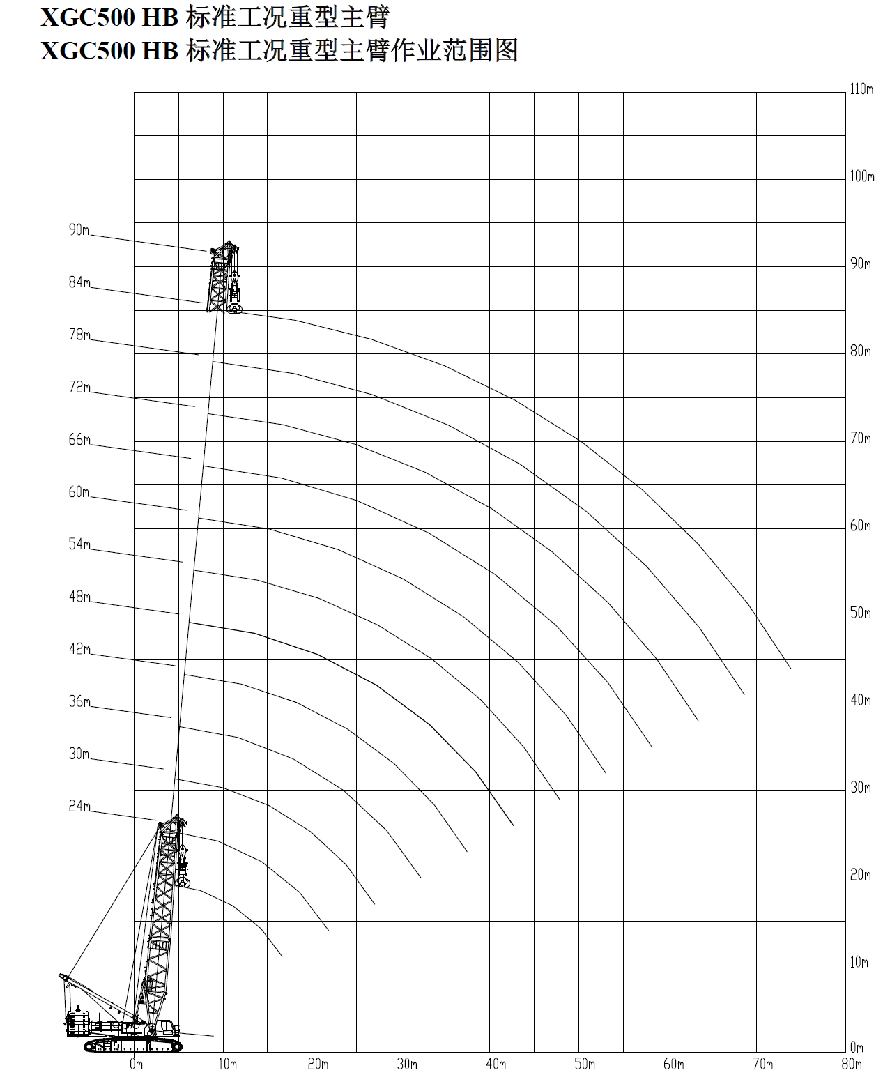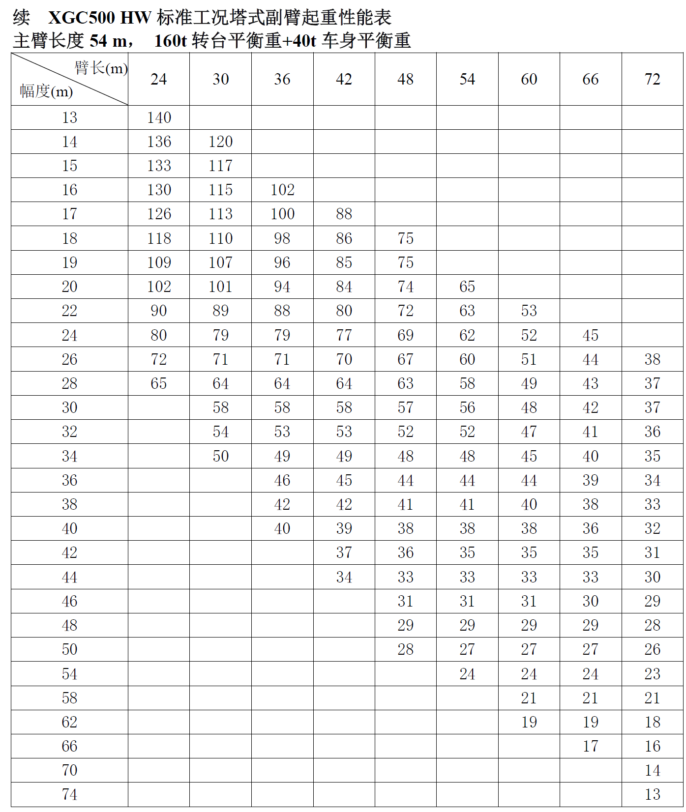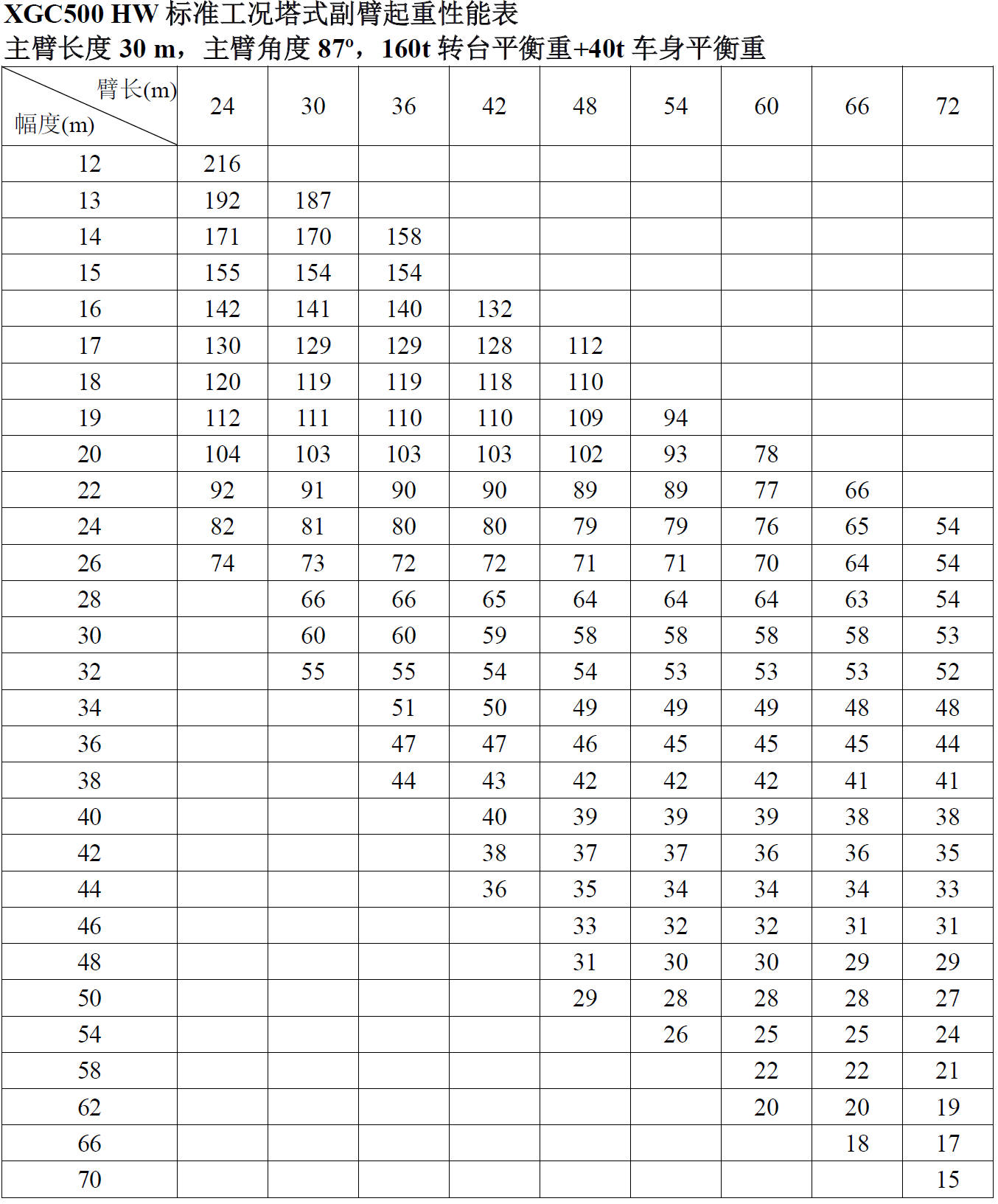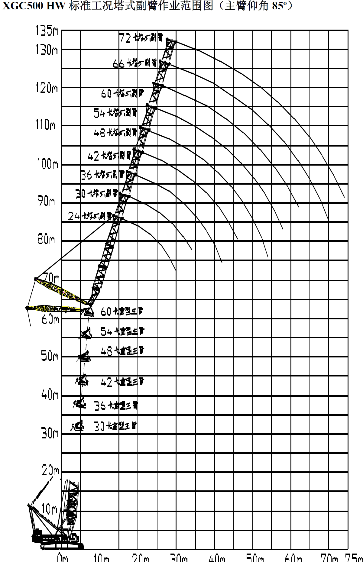 3)HW :重型主臂 :重型主臂 +塔式副臂 ,塔式副臂 ,塔式副臂 ,24 ~72 米, 1个 10 .5 米塔式副臂底 节, 3个 6米塔式副臂 厚壁 中间节, 1个 12 米塔式副臂 厚壁 中间节, 2个 12 米 塔式副臂 薄壁 中间节, 1个 7.5 米塔式副臂顶节。