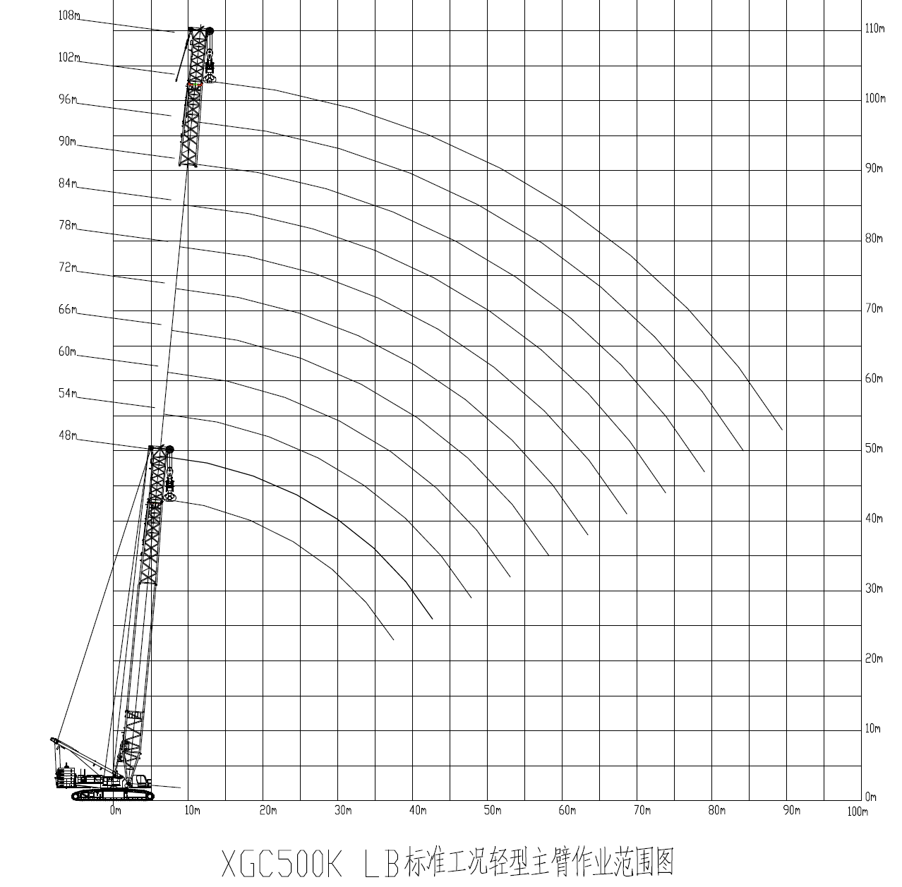 2)LB :轻型主臂, :轻型主臂, 48~10 8米, 1个 10.5 米重型底节, 2个 12 米厚壁主臂 中间 节,2个 12 米薄壁主臂中间 节,1个 6米过渡节, 2个 6米塔式副臂 厚壁 中 间节 ,1个 12 米塔式副臂 厚壁 中间节 ,1个 12 米塔式副臂 薄壁 中间节, 1个 7.5 米塔式副臂顶节。