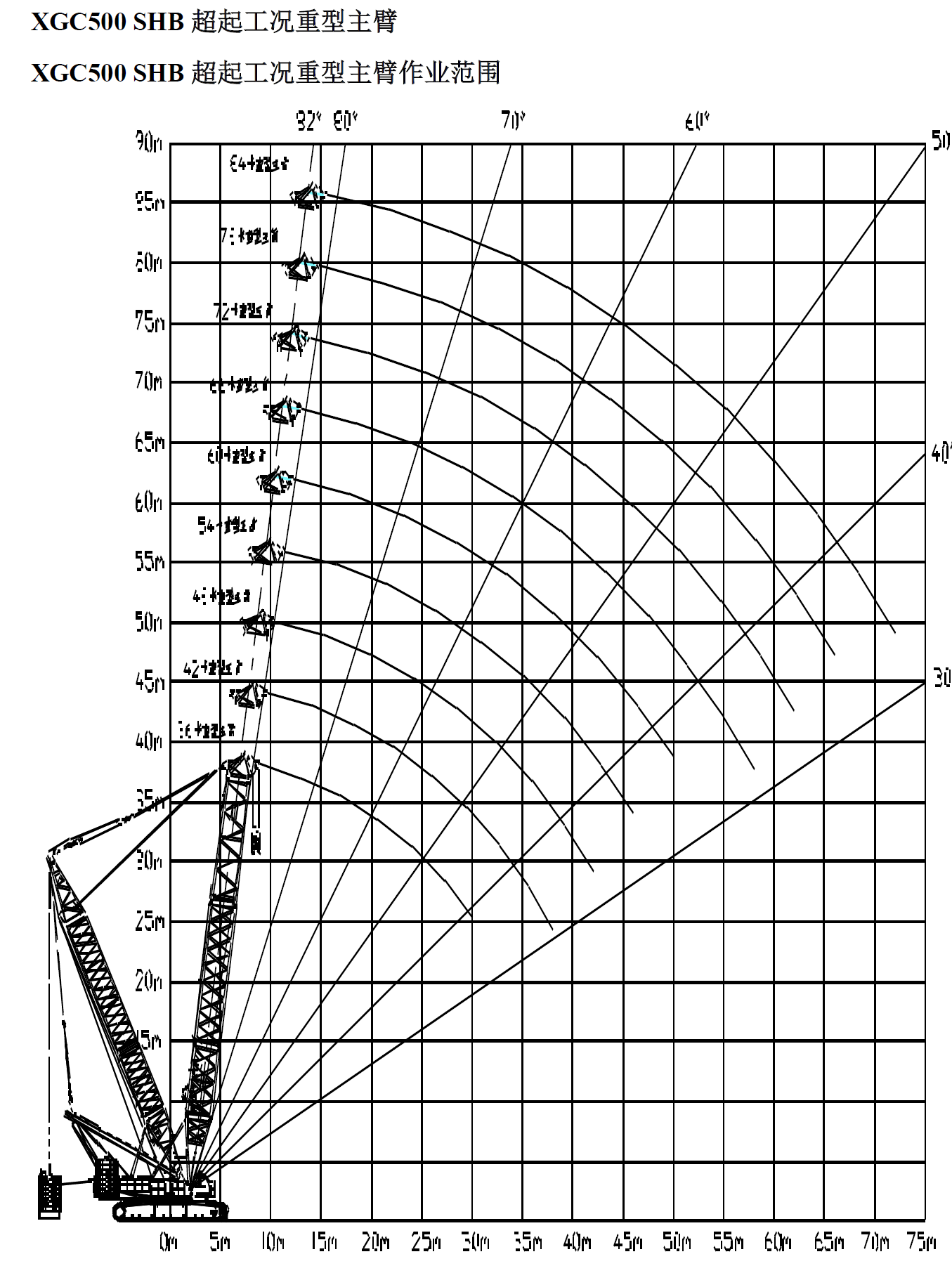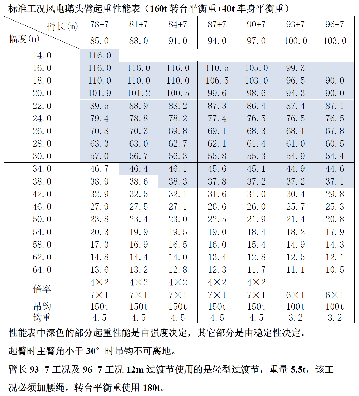 4)SHVJ:超起重型主臂+风电额头臂(选装),重型主臂78~108 米,风电额头臂7 米,风电额头臂安装角度为22 度
