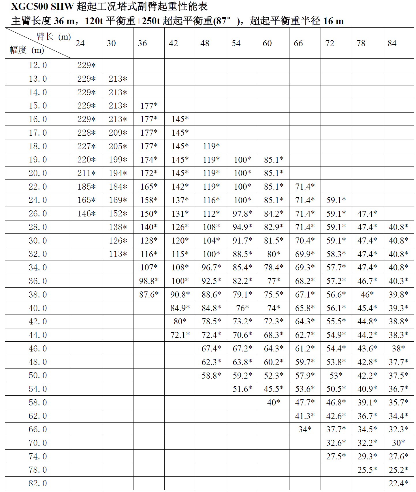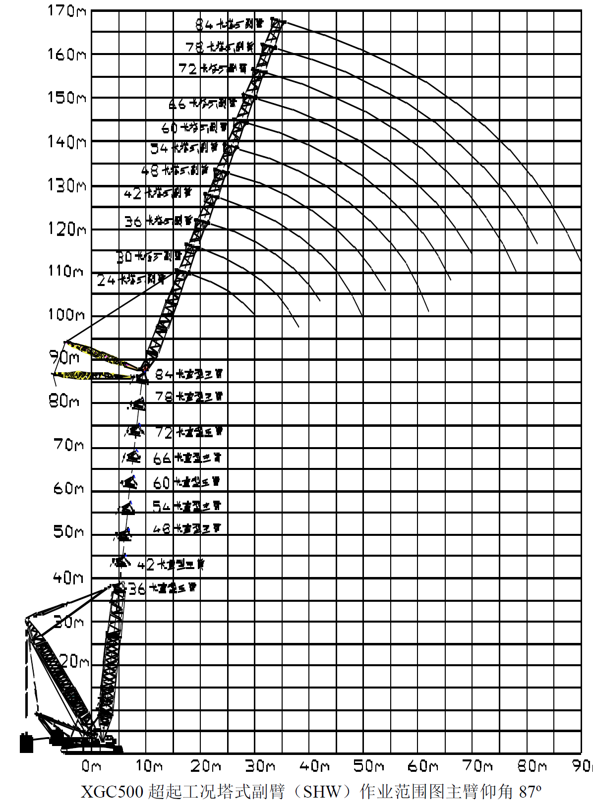 3)SHW:超起重型主臂+塔式副臂,塔式副臂24~84 米,1 个10.5 米塔式副臂底节,3 个6 米塔式副臂厚壁中间节,1 个12 米塔式副臂厚壁中间节,3 个12 米塔式副臂薄壁中间节,1 个7.5 米塔式副臂顶节。
