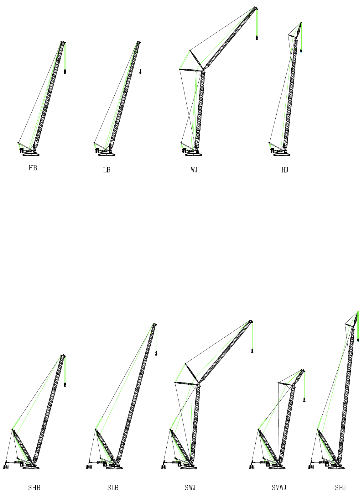 4)SVWJ:超起工况 重型主臂 +专用副臂 (选配) ,主臂长度为 42 ~108 米时 可安装专用副臂 。主臂由 10.5m 主臂 底节 ×1 ,6m主臂中间 节×2,12m 厚壁主臂 中间节 A×1,12m 主臂 中间节 B×2,12m 主臂 腰绳 节 B×1, 12m 薄壁主臂 壁主臂 中间节 中间节 C×1,12m 薄壁主臂 腰绳 节 C×1,12m 过渡 节×1 ,1.5m 臂头 ×1 。专用副臂由 4.5 米塔式副臂底节 ×1 和 7.5 米塔式副臂顶节 ×1 组成 。