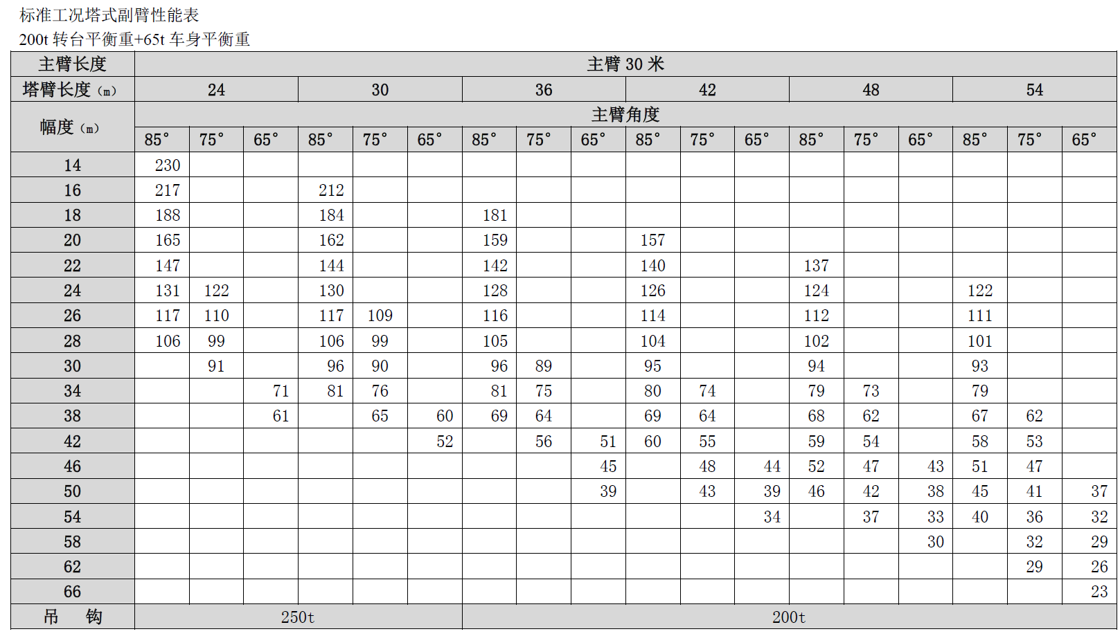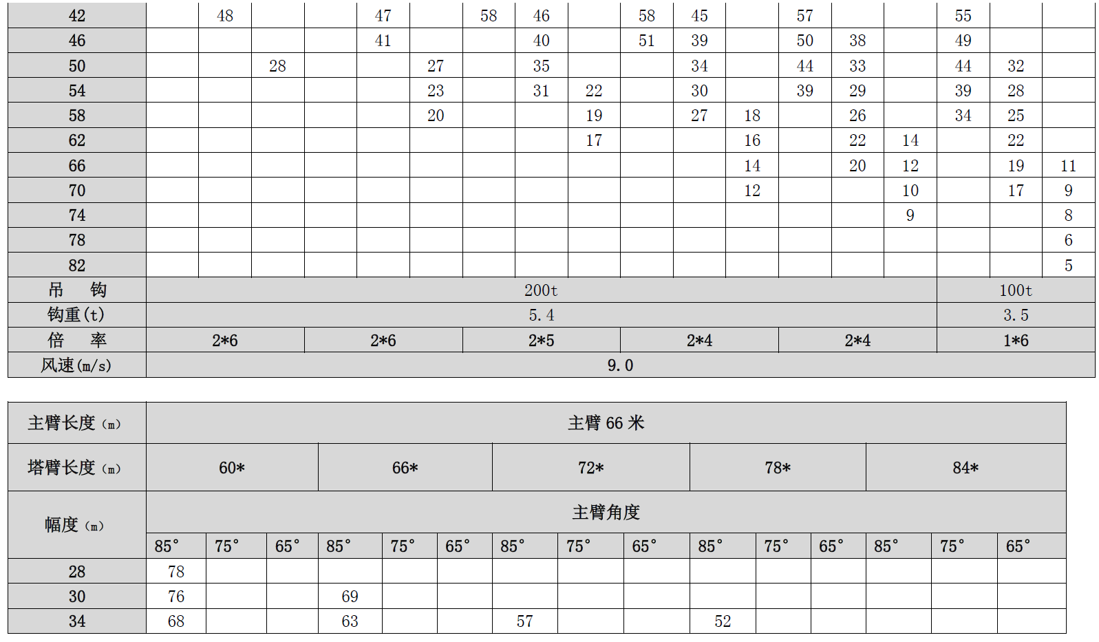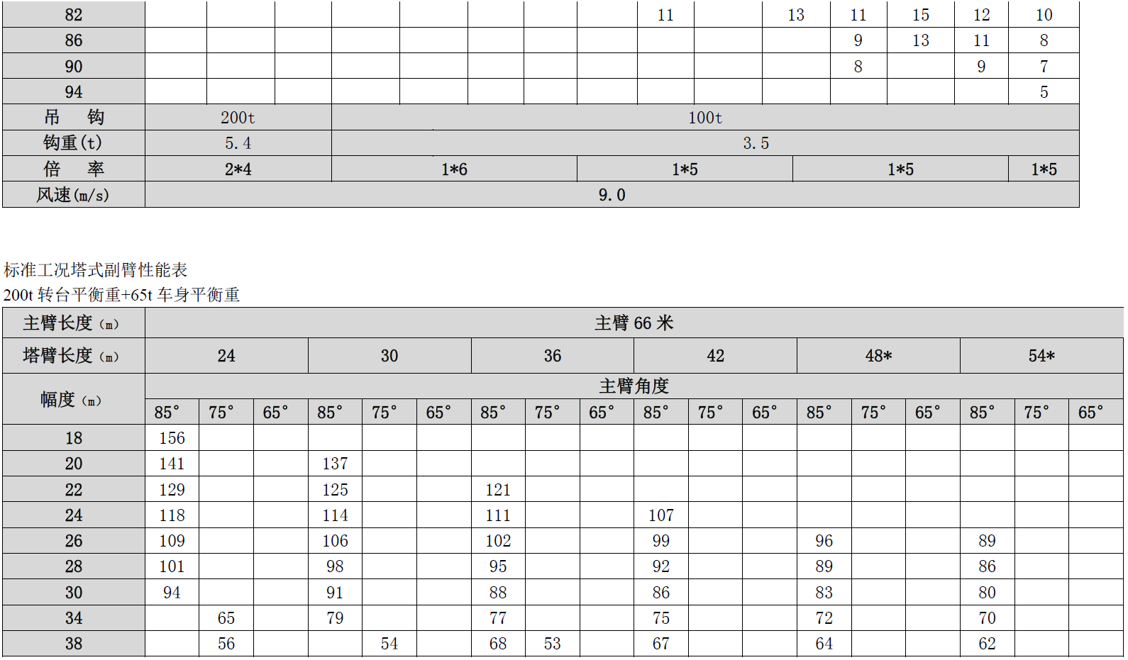4)WJ:标准 重型主臂 +塔式副臂,主长度为 30 ~66米时可安装塔式副臂 米时可安装塔式副臂 24 ~84 米, 4.5 米塔式副臂底节 米塔式副臂底节 ×1 ,6米塔式副臂中间节 ×2, 12 米塔式副臂 厚壁 中间节 A×1 ,12 米塔式副臂 厚壁 中间节 B×2,12 米塔式副臂 薄臂 中间节 C×2,7.5 米塔式副臂顶节 ×1 。
