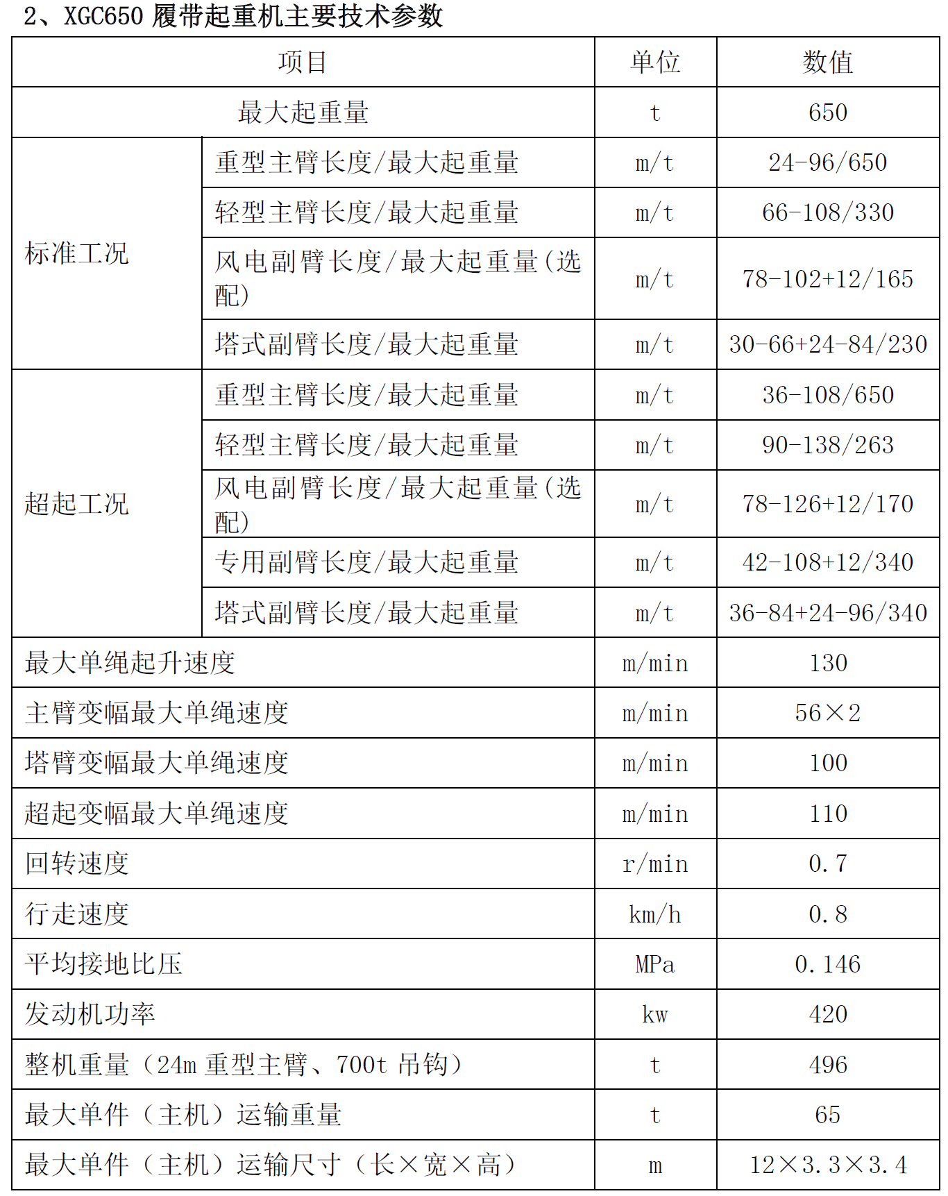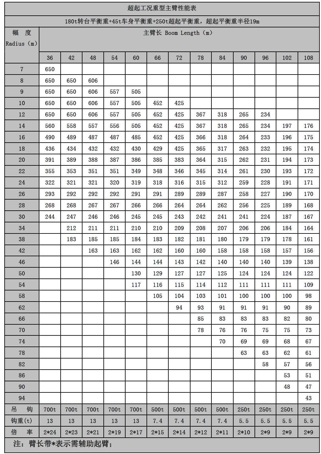 1)SHB :超起工况 重型主臂, 36 ~108 米,10.5m 主臂 底节 ×1 ,6m主臂中间 节×2,12m 厚壁主臂 中间节 A×1 ,12m 主臂 中间节 B×2,12m 主臂腰绳节 B×1, 12m 薄厚壁主臂 中间节 C×2,12m 过渡 节×1 ,1.5m 臂头 ×1 。