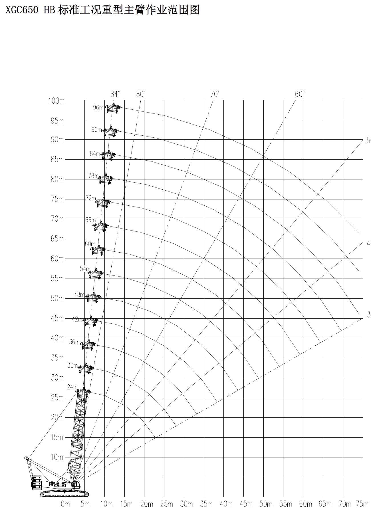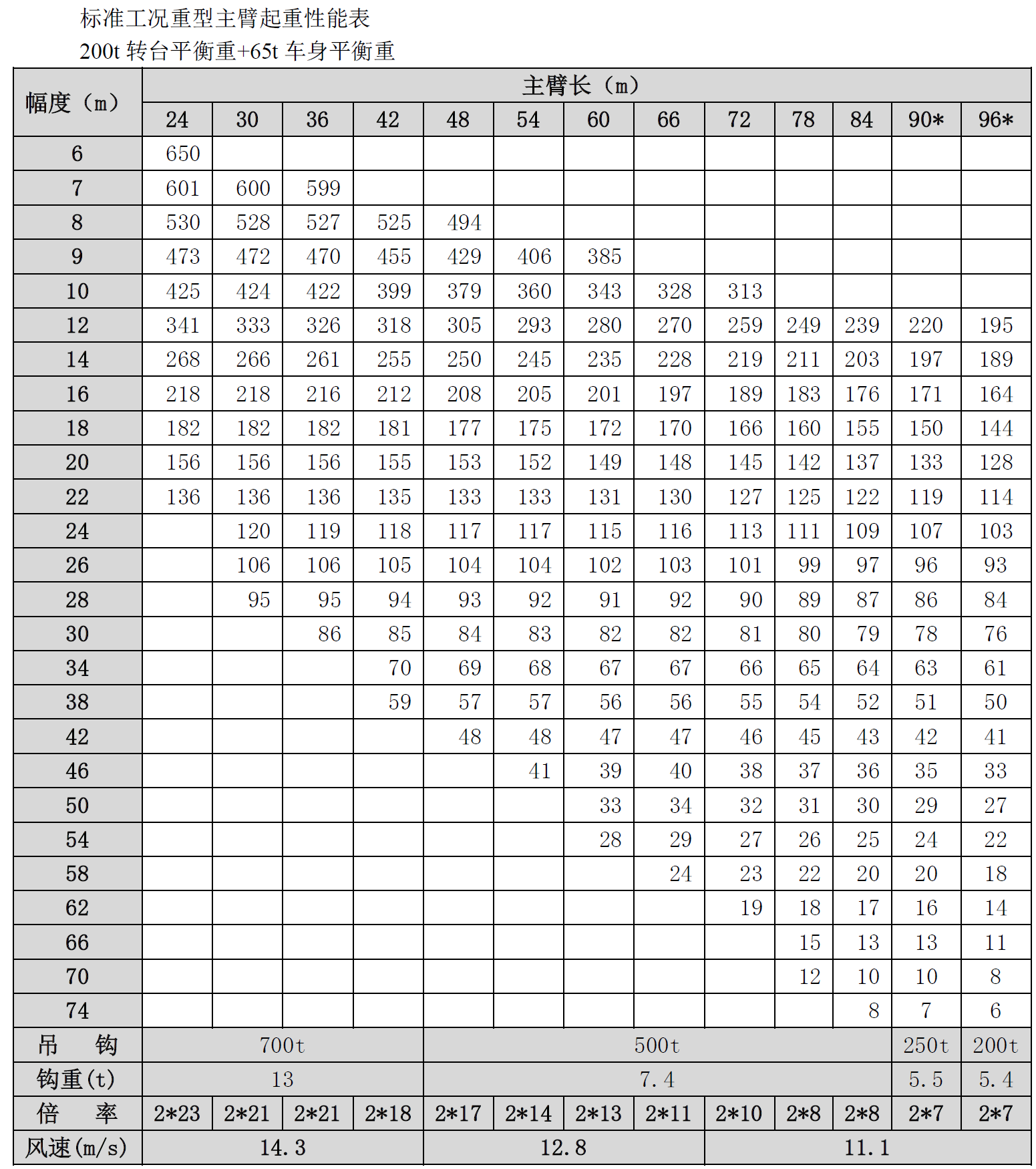 1)HB :标准工况重型主臂, 24 ~96 米, 10.5m 主臂 底节 ×1 ,6m主臂中间 节×2,12m 厚壁主臂 中间节 A×1,12m 主臂 中间节 B×2,12m 主臂腰绳节 B×1, 12m 薄壁主臂 中间节 C×1,12m 过渡 节×1 ,1.5m 臂头×1 。
