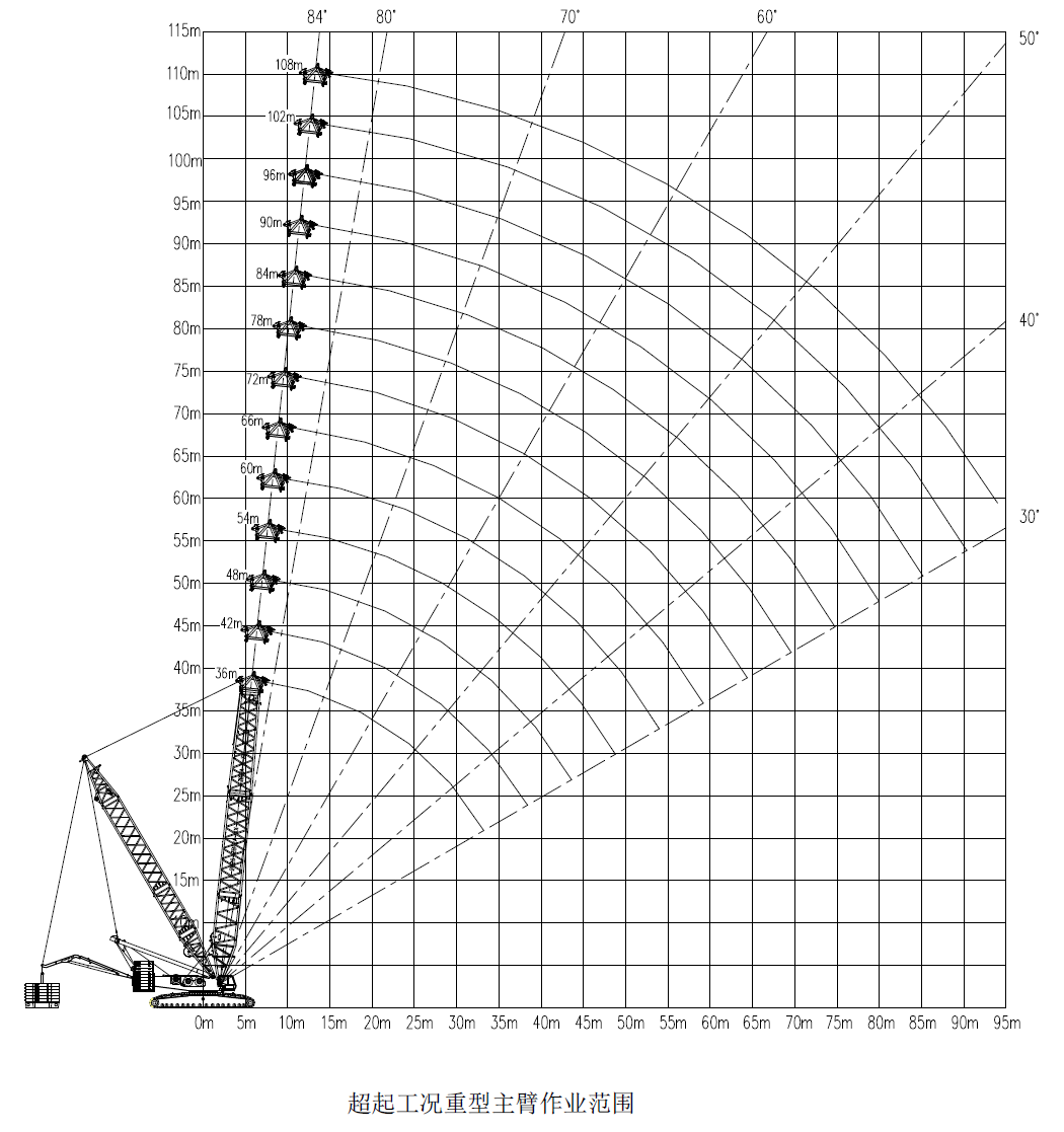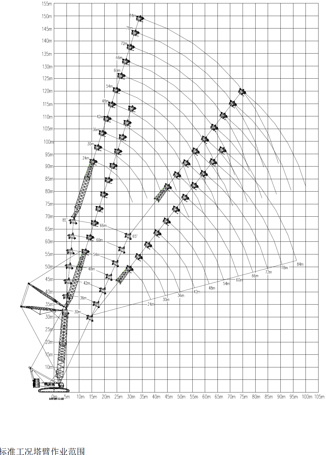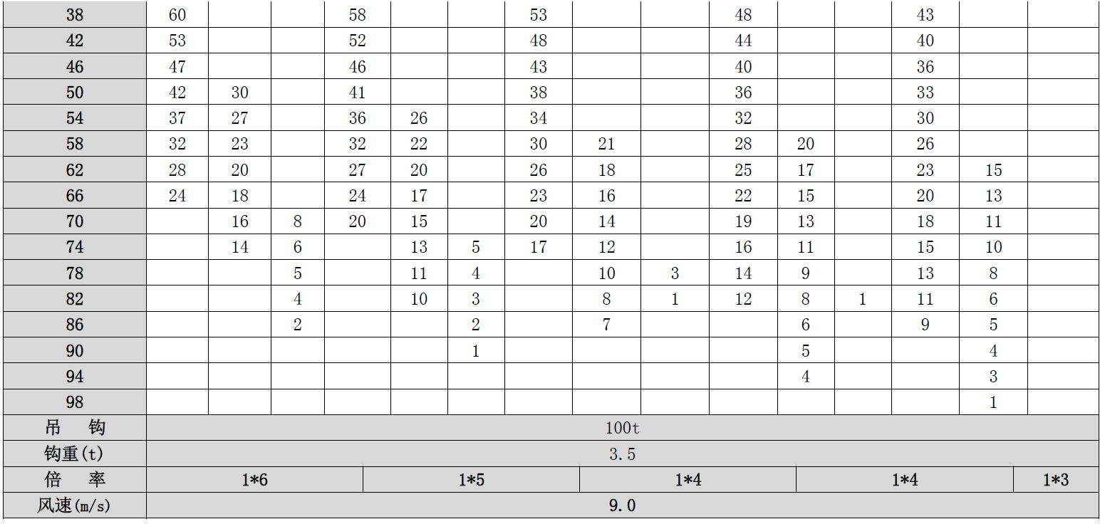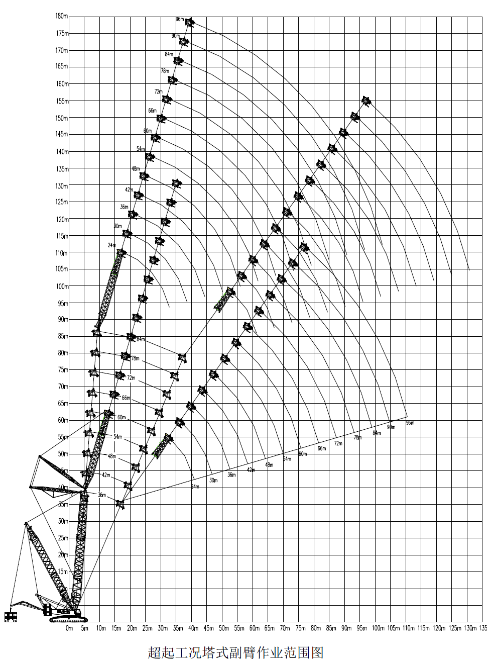 3)SWJ:超起工况 重型主臂 +塔式副臂,主长度为 塔式副臂,主长度为 36 ~84 米时可安装塔式 副臂 24 ~96 米, 4.5 米塔式副臂底节 ×1 ,6米塔式副臂中间节 ×2, 12 米塔式 副臂 厚壁 中间节 A×1 ,12 米塔式副臂 厚壁 中间 节 B×2, 12 米塔式副臂 米塔式副臂 薄臂 中 间节 C×3,7.5 米塔式副臂顶节 ×1 。