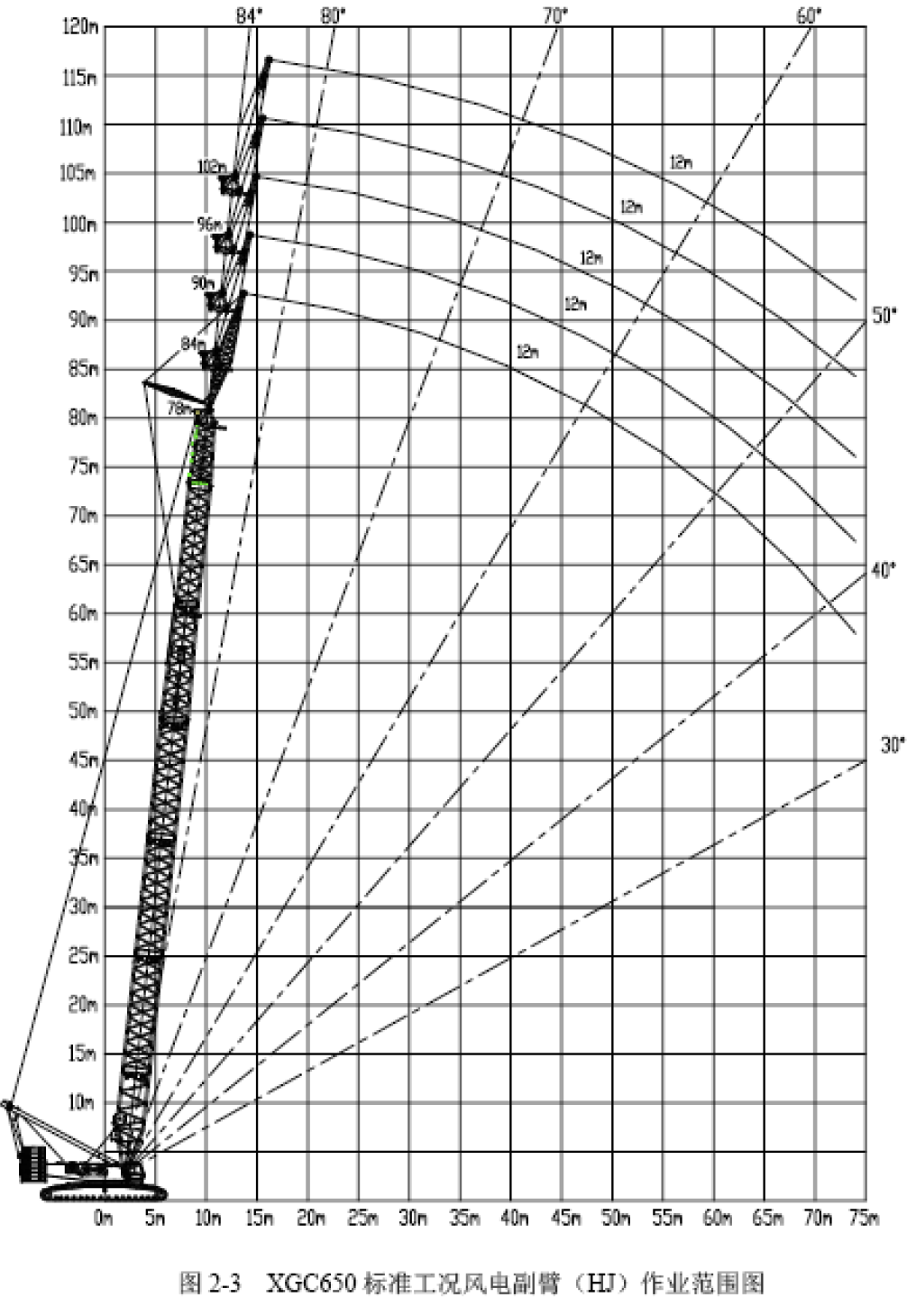 3)HJ:标准工况风电 主臂 +风电 副臂 (选配) ,主臂长度为 78 ~102 米时可 安装 风电 副臂 ,主臂由 10.5m 主臂 底节 ×1 ,6m主臂中间 节×2,12m 厚壁主臂 中 间节 A×1,12m 主臂 中间节 中间节 B×2,12m 主臂 腰绳 节 C×1,12m 过渡 节×1 ,12 米 塔臂 厚壁 中间节 A×1 ,7.5 米塔 式副臂顶节 ×1 。风电 副臂 为 12 米×1 。