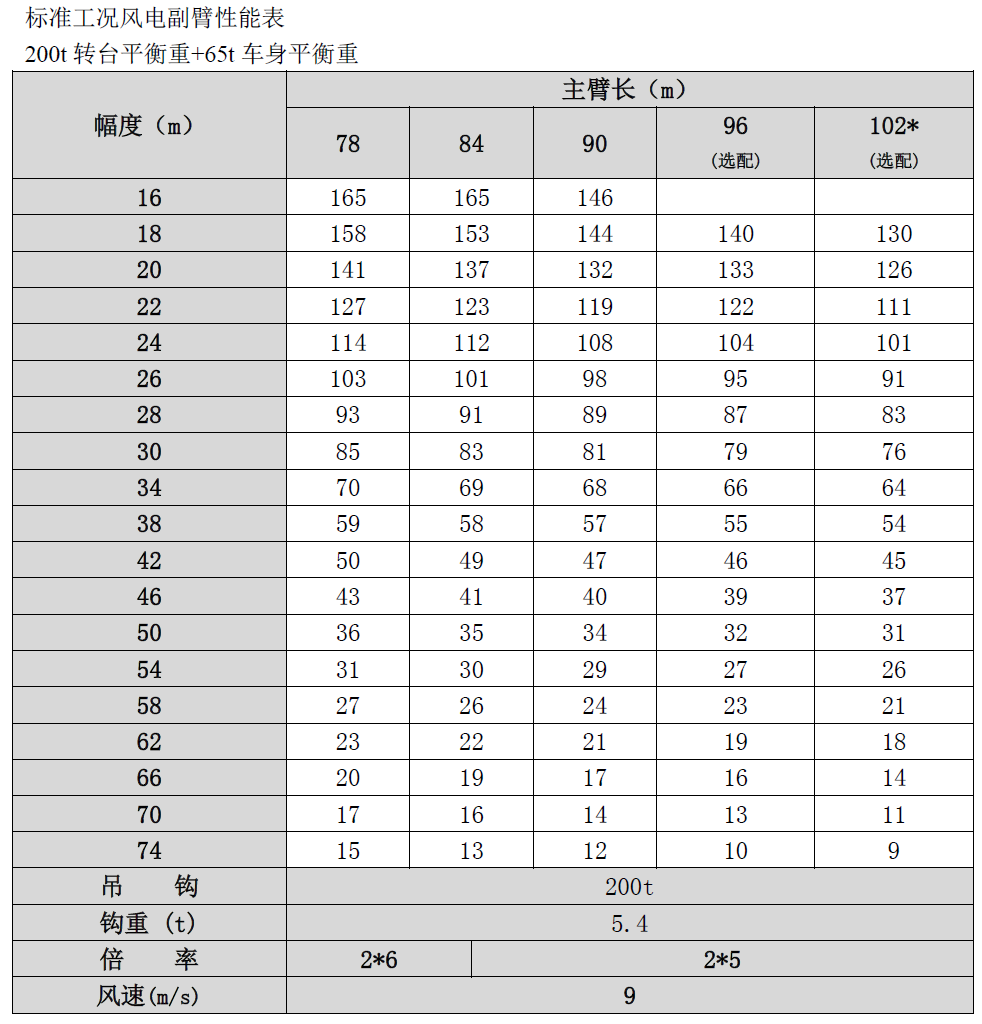 5)SH J:超起工况风电 主臂 +风电 副臂 (选配) ,主臂长度为 ,主臂长度为 78 ~126 米时可 安装 风电 副臂 ,主臂由 10.5m 主臂 底节 ×1 ,6m主臂中间 节×2,12m 厚壁主臂 中 间节 A×1,12m 主臂 中间节 B×2,12m 主臂 腰绳 节 B×1,12m 薄壁主臂 中间节 C×2, 12m 薄壁主臂 腰绳 节 C×1,12m 过渡 节×1 ,7.5 米塔式副臂顶节 ×1 。风电副臂 为 12 米×1 。