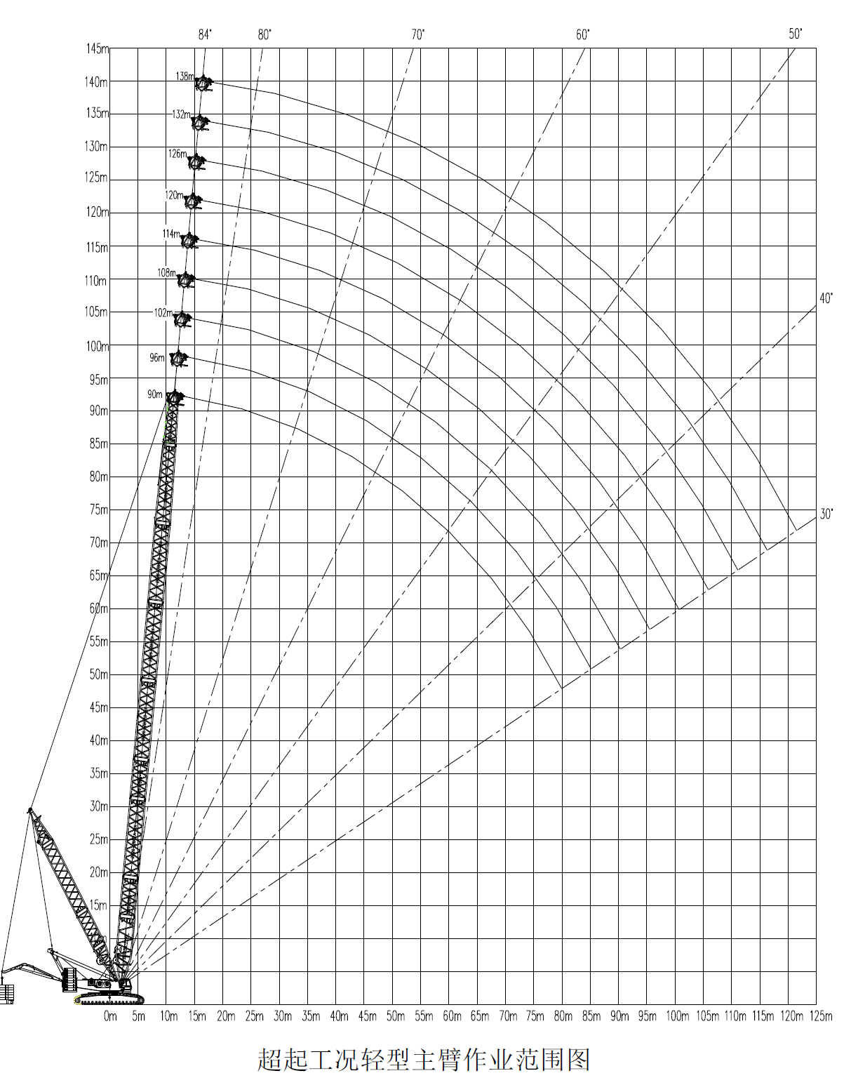 2)SLB :超起工况 轻型主臂, 轻型主臂, 90 ~138 米, 1个 10.5 m主臂 底节 ,6m主臂中 间节×2, 12m 主臂 中间节 B×2,12m 主臂腰绳节 B×1,12m 过渡 节×1 ,6m 塔式 副臂 厚壁 中间节 ×2,12 m塔式副臂 厚壁 中间节 A×1,12 m塔式副臂中间节 B×2, 7.5m 塔式副臂顶节 ×1 。